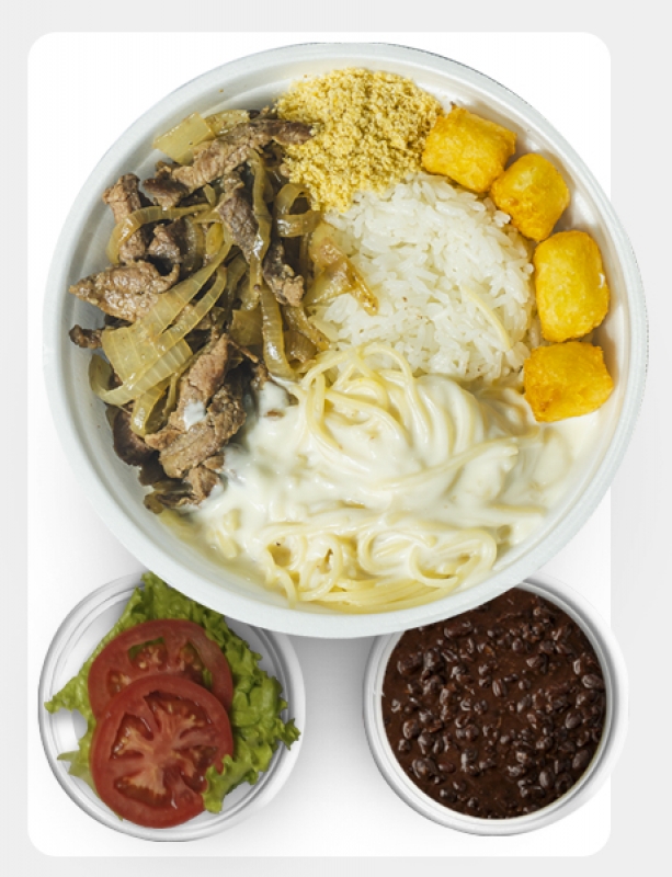 Acompanhada de arroz, feijão, massa ao molho branco, aipim frito, farofa e legumes.